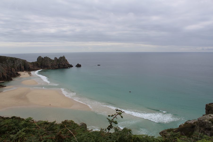 Although the white sands were sheltered from a chill wind, I wasn’t in the mood for lazing. I intended to explore a path that snaked its way up the east cliff. The climb was worth the effort, affording a wonderful view of Pedn Vounder beach. Another almost deserted beach, but with such a steep climb down to it, beyond me, that wasn’t surprising. Nor was the tide far enough out to walk from Porthcurno beach. Some other time.